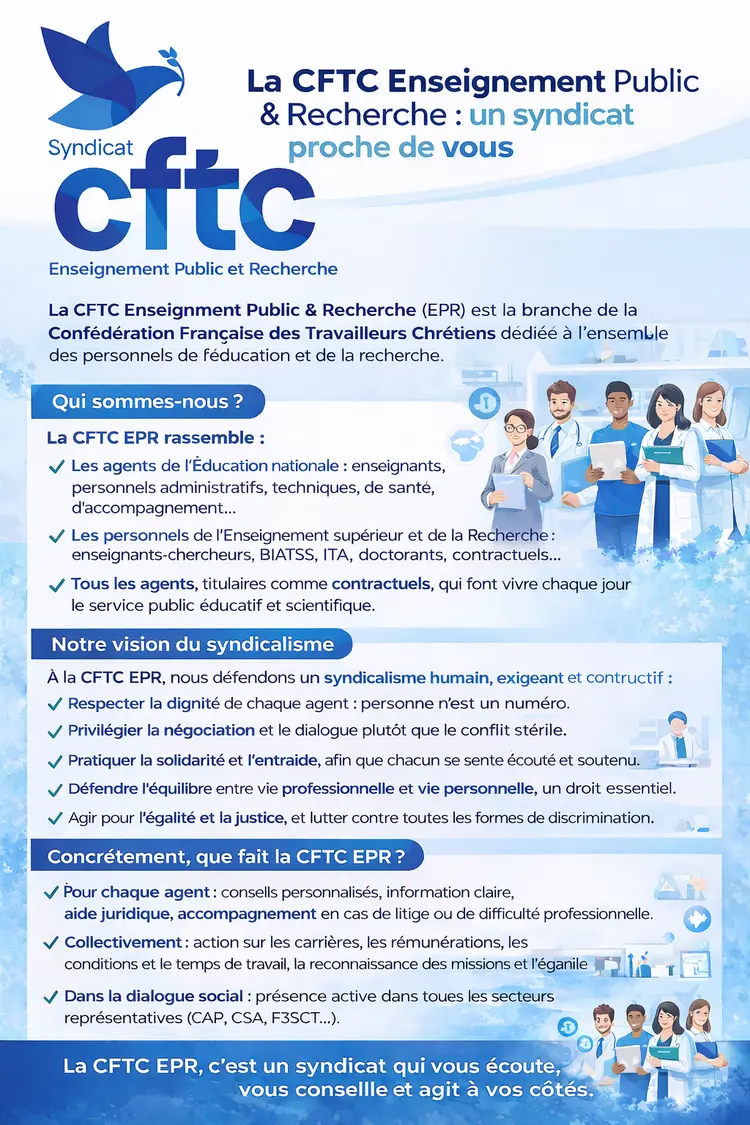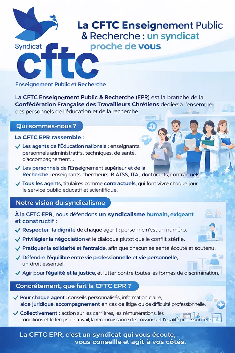 La CFTC EPR, un syndicat constructif au service des agents de l'Education nationale et de l'Enseignement Supérieur et de la Recherche.